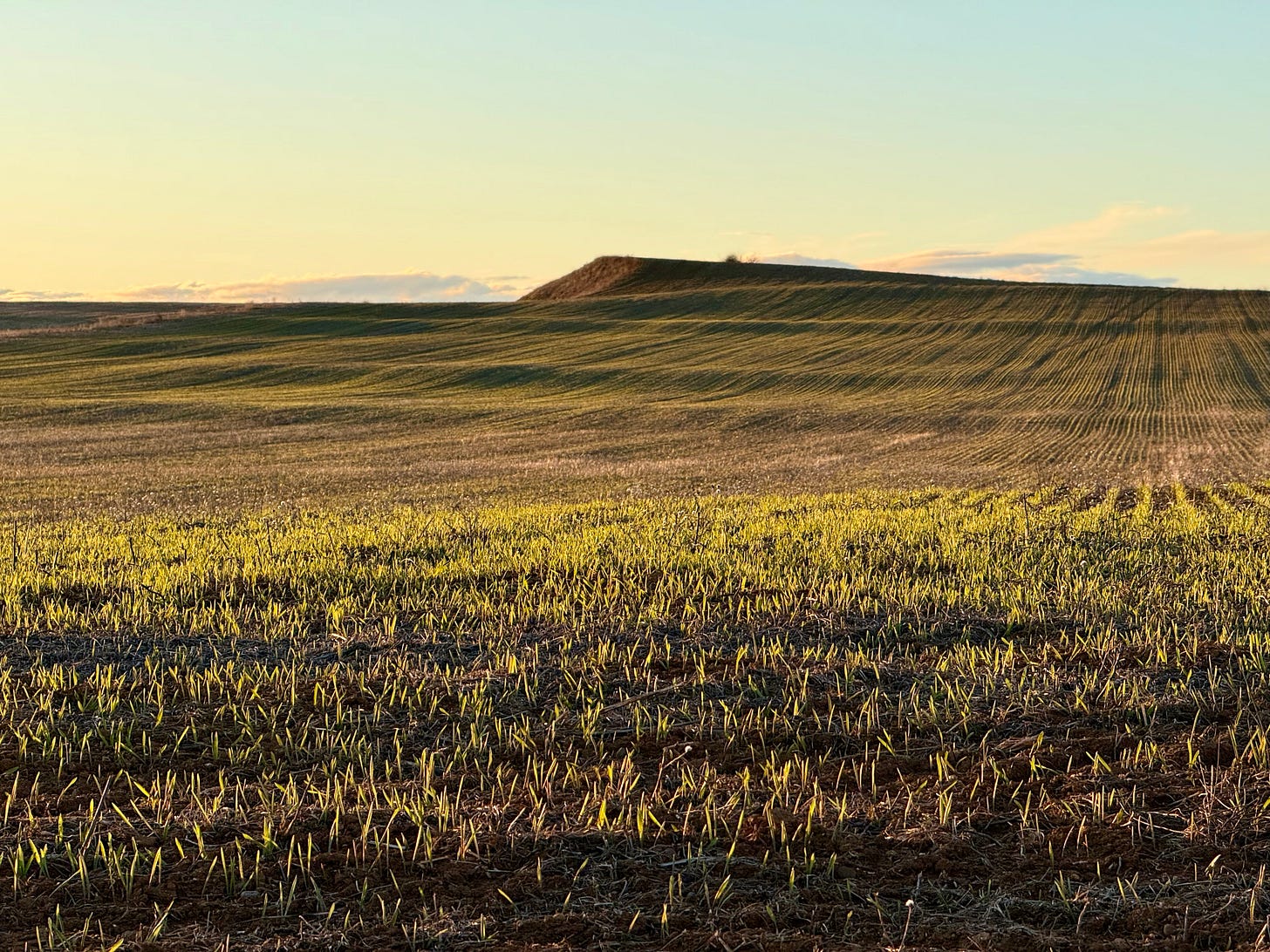 Another few kilometres and we begin the gentle climb up to the flat plain that will lead us into town. The sun is all but set now and the tiny, isolated sprigs of wheat that have managed to push through the sodden ground are outlined in a million little halos. Subtle irregularities in an otherwise endlessly monotone landscape are thrown into shadow moments before the gold turns to dusty pink and the landscape returns to a featureless beige canvas as far as the eye can see.